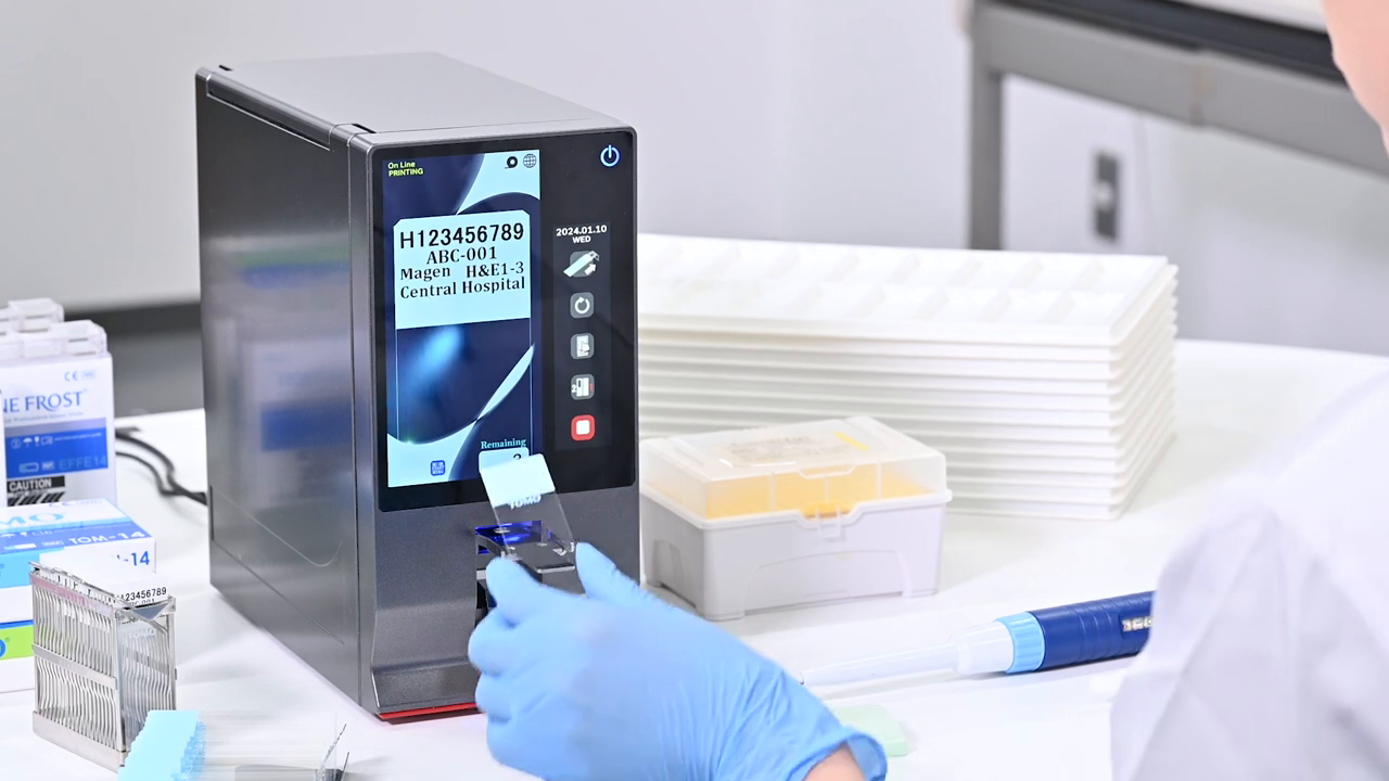 With its compact design, dual touchscreen controls, and solvent-resistant printing technology, the ESPO II fits effortlessly into even the busiest lab settings — whether used alongside a microtome or as part of a high-throughput slide preparation station.