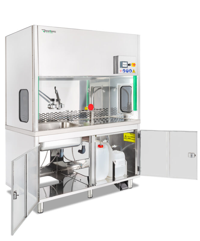 - Integrated vacuumed bottom housing for safe storage of new and spent formalin containers.