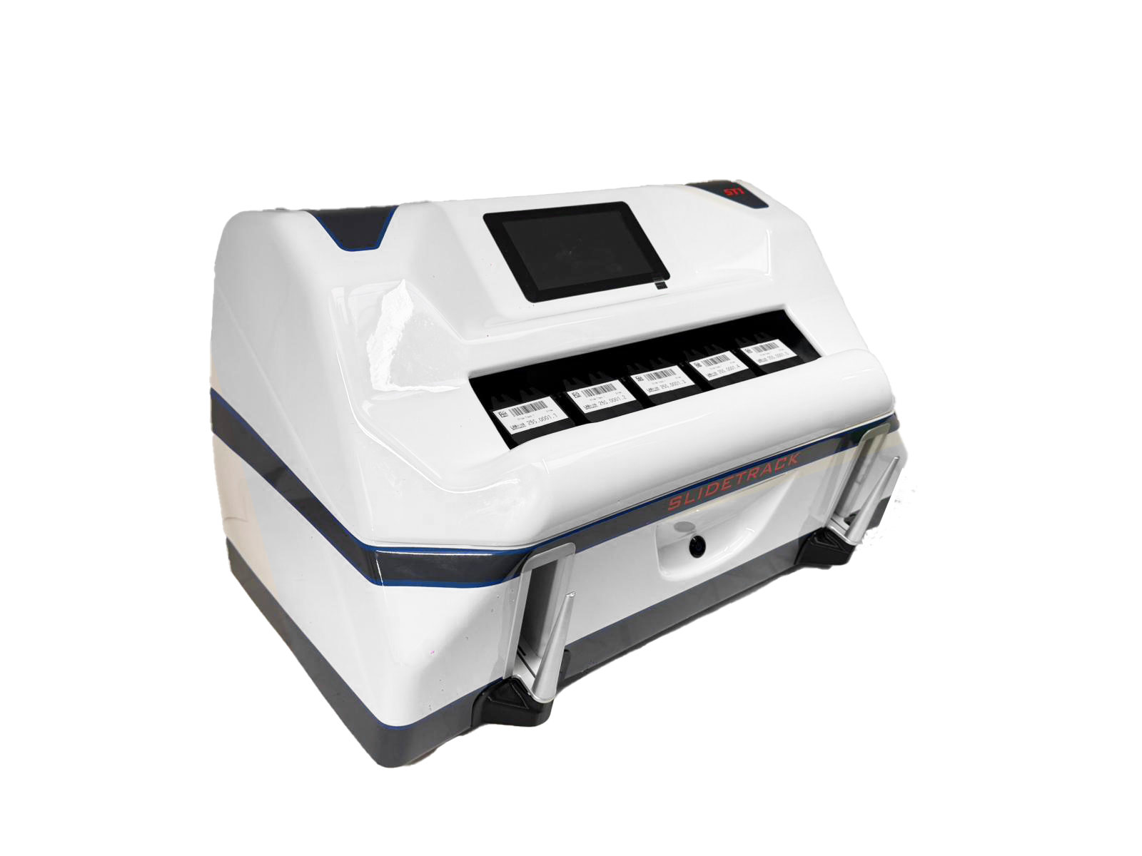 SlideTrack is a benchtop system that automates the sorting and archiving of pathology slides. An operator can load up to two hundred slides at a time then walk away, allowing SlideTrack to process independently.