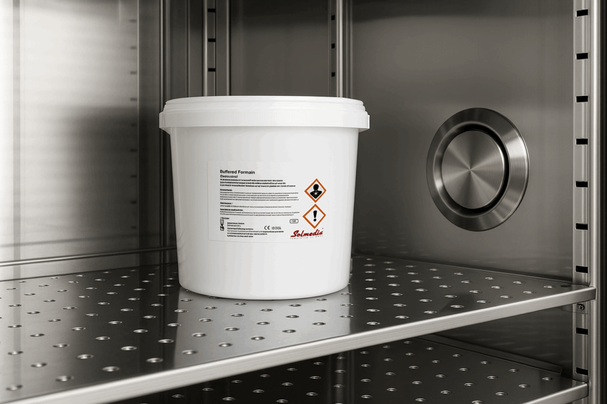 Reduce spill, splash and exposure risks from formalin/formaldehyde in pathology and histology labs by adopting a simple, evidence-based rule: store large or breakable formalin containers below shoulder (eye) height. This briefing explains why the rule matters, links to UK guidance, and practical controls — including Solmedia product suggestions — that make compliance simple and effective.