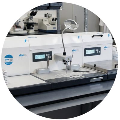 SLEE systems combine adjustable magnifiers with integrated LED illumination directly on the workstation. This enables technicians to accurately orient small or delicate tissue samples while maintaining clear, shadow-free visibility.